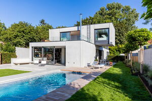 Mit dem Bekenntnis zu klarer Form und dem Werkstoff Beton entstand das markante kubische Einfamilienhaus. Beide unterstreichen die moderne Architektur und lassen den Baukörper glaubhaft als gestapelte Quader auftreten.